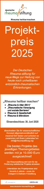 - Aus den Arbeiten soll ein Impuls für die rheumatologische Grundlagenforschung, klinische Rheumatologie, die Versorgung oder die Wahrnehmung von Patienten mit rheumatischen Erkrankungen hervorgehen.